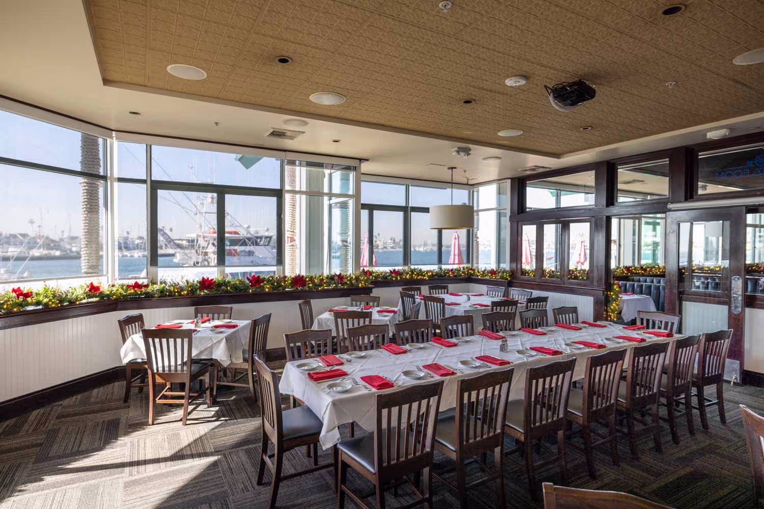 The Main Dining Room and Bar & Lounge at Boathouse on the Bay offer a seamless blend of fine dining and casual elegance. Available year-round, this space comfortably seats up to 120 guests and accommodates up to 200 for cocktail receptions. Built-in microphone and large-screen TV options support presentations and celebrations alike.